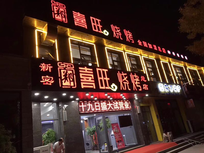 新密鄭喜旺燒烤在鄭州的1200平米總店開在了鄭州市英協路福元路交叉路口往西150米路北銀基王朝大門旁。