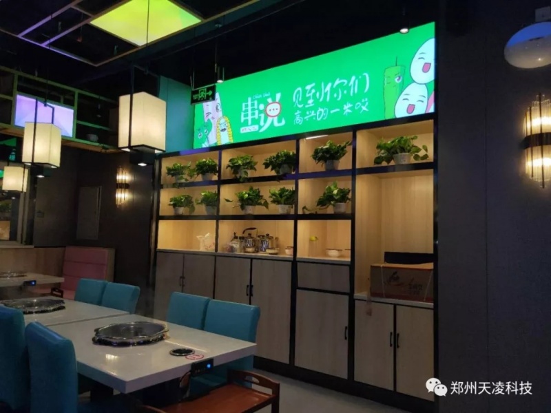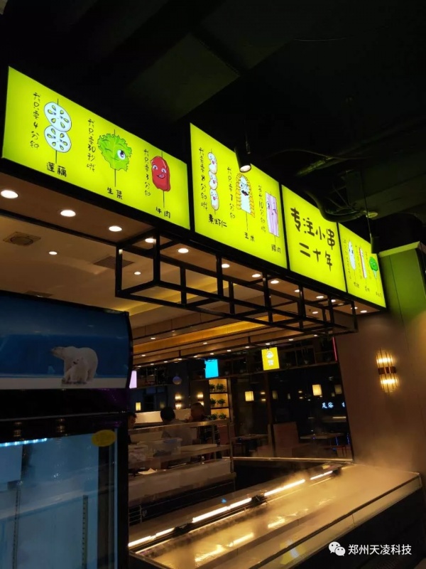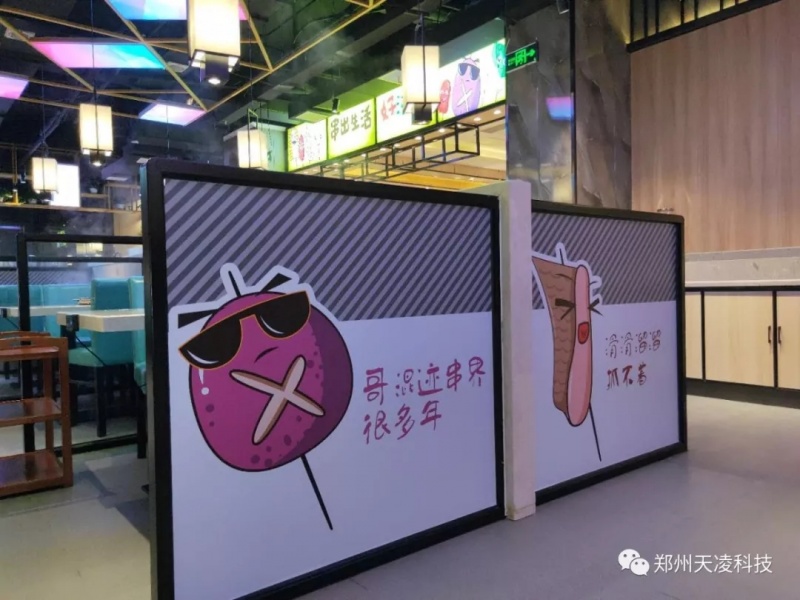 店內活潑的冷暖色調相間也是誘發食欲的催化劑,一個個可愛的卡通涮品形象,跳躍于墻邊,閃現在屏幕上,輕松愉悅的氛圍瞬間洋溢于角角落落。20年老字號對串串食材的情誼,都注入于這些鮮活的形象之中。