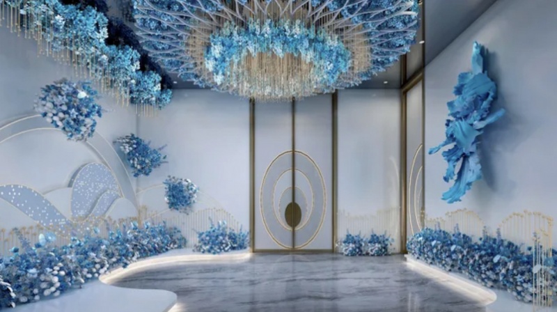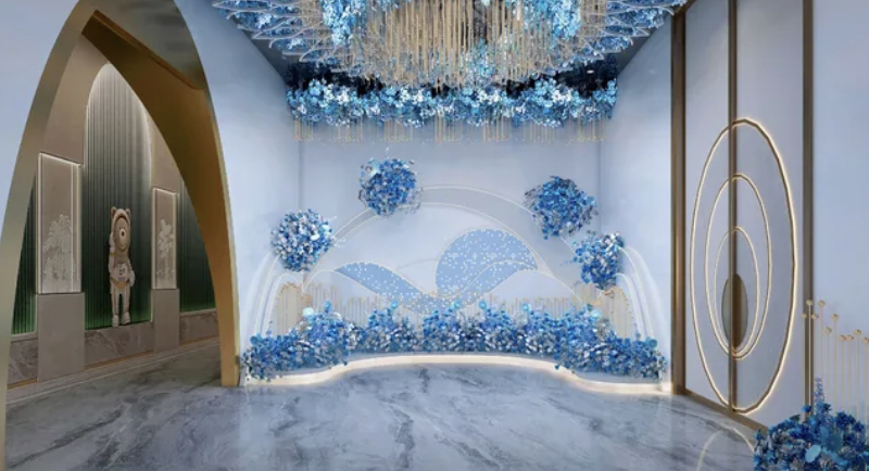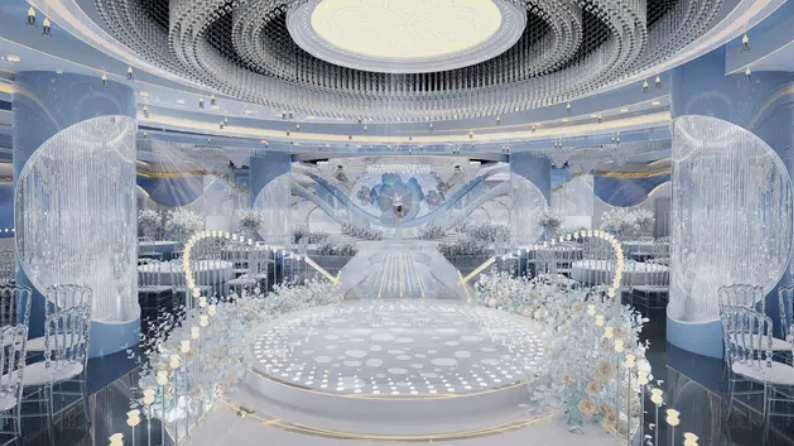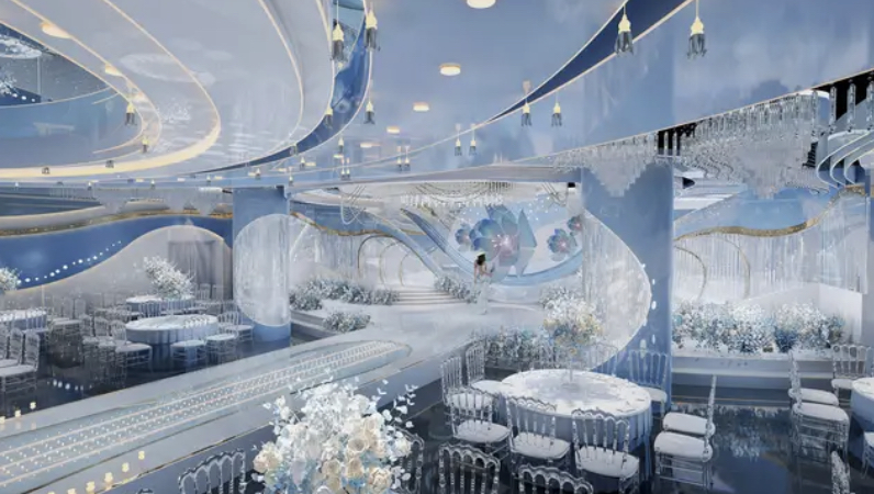 滿船清夢壓星河,精美的水晶吊頂,百萬級婚禮宴會廳,萬顆水晶透過光折射出流線型的光影,詮釋水晶的靈動與極致表現(xiàn)力,科技百變的燈光效果為婚禮宴會廳增添了夢幻的氛圍,清爽的藍(lán)與純潔無暇的白,將一個干凈的空間打造成有生命力有溫度的婚禮空間。